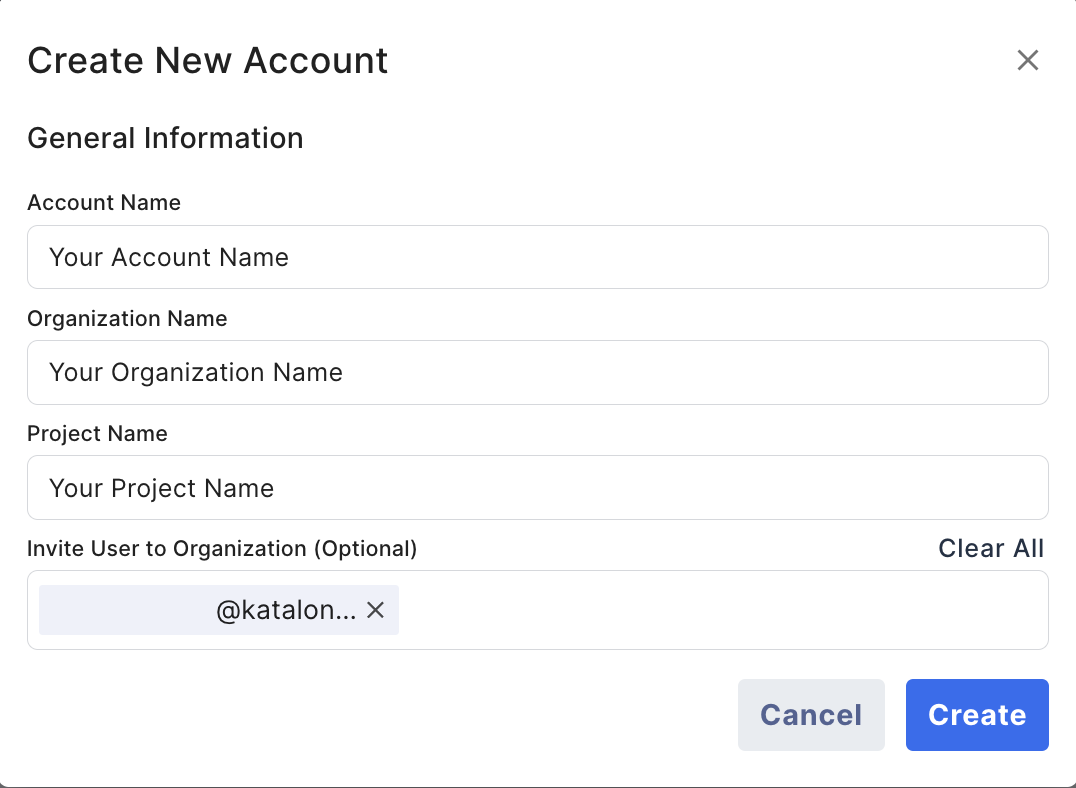 This document shows you how to manually create an Account and Organization in Katalon TestOps.