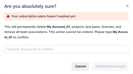 This action will permanently delete your Account including your Organization, test plans, licenses, and remove all Projects associations. Proceed with caution as this cannot be undone.