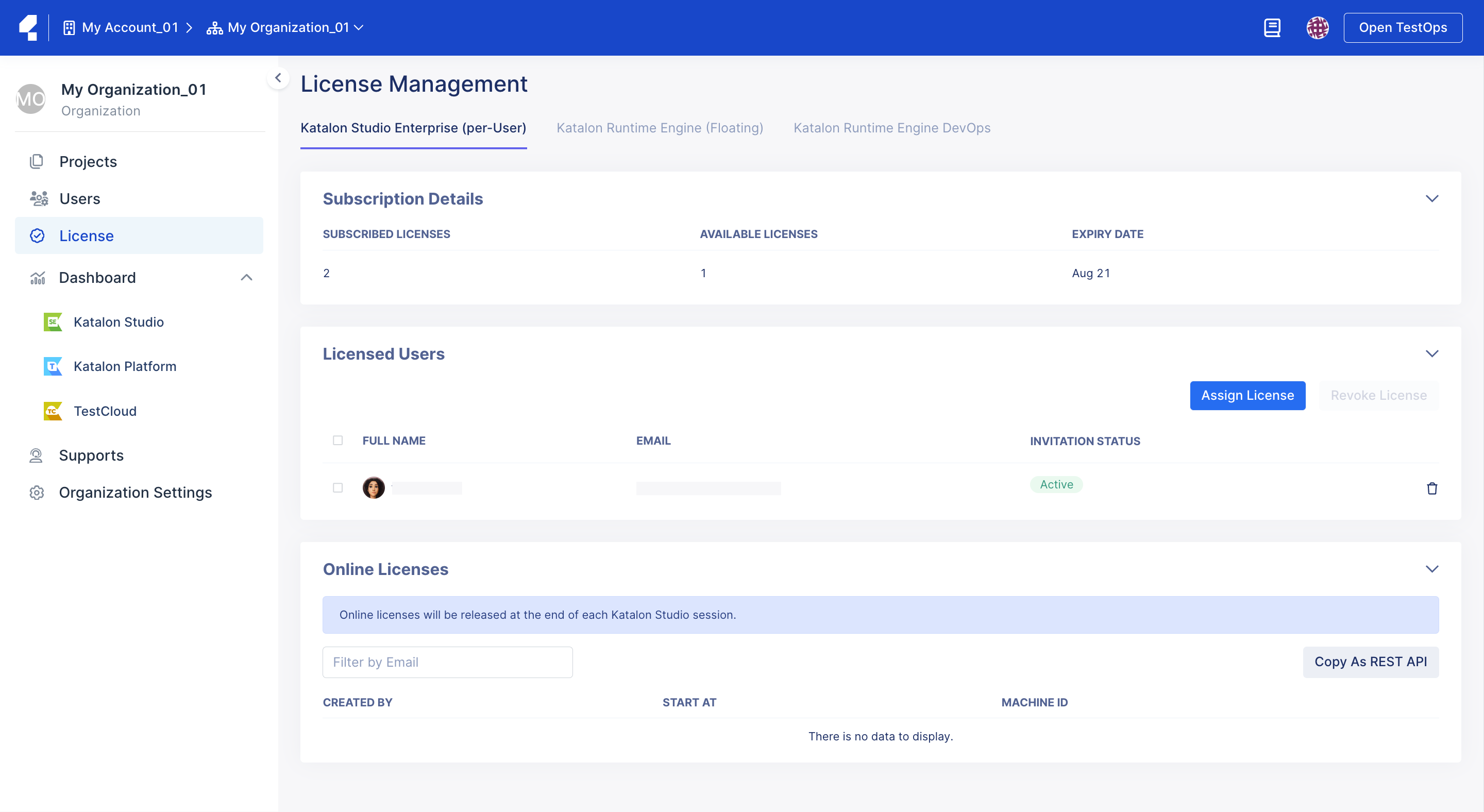 After purchasing Katalon Studio Enterprise (KSE) and/or Katalon Runtime Engine (KRE) licenses, you can attribute, transfer, and remove granted licenses from Katalon TestOps.