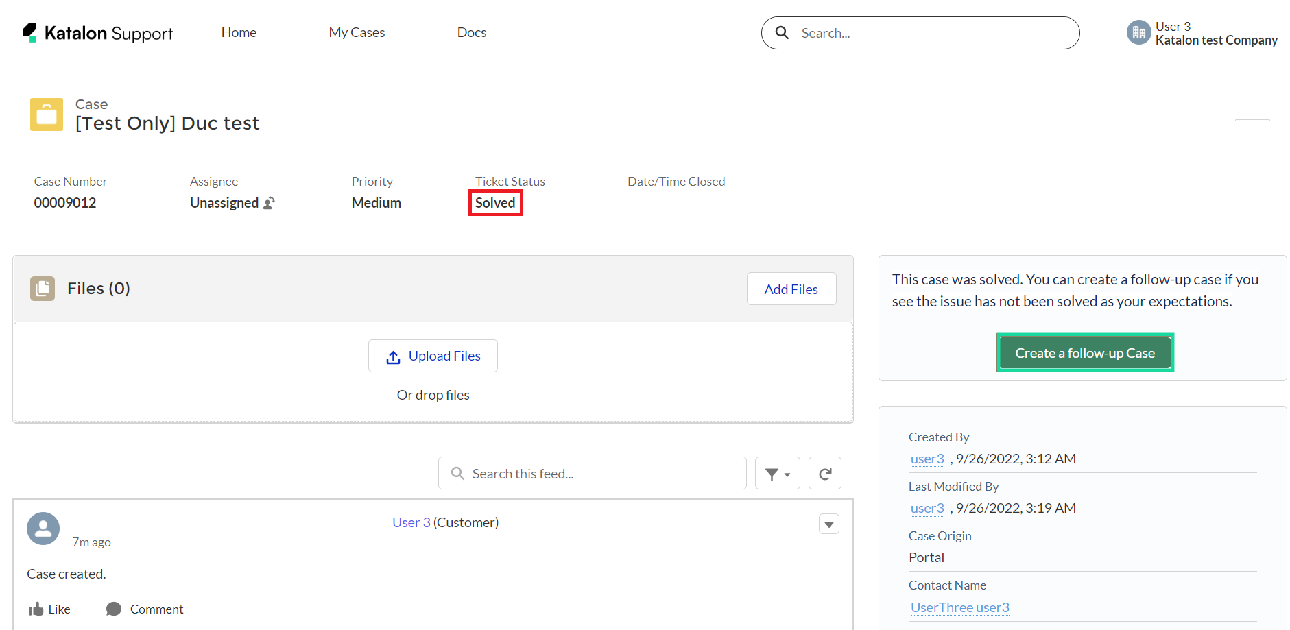 - To mark a Support case as Solved, on your support case, click Mark Case as Solved as shown below. Then confirm to close the Support case.Note: Only the Owner of the Support case can mark it as Solved. Katalon users cannot mark Support cases of other users as resolved.