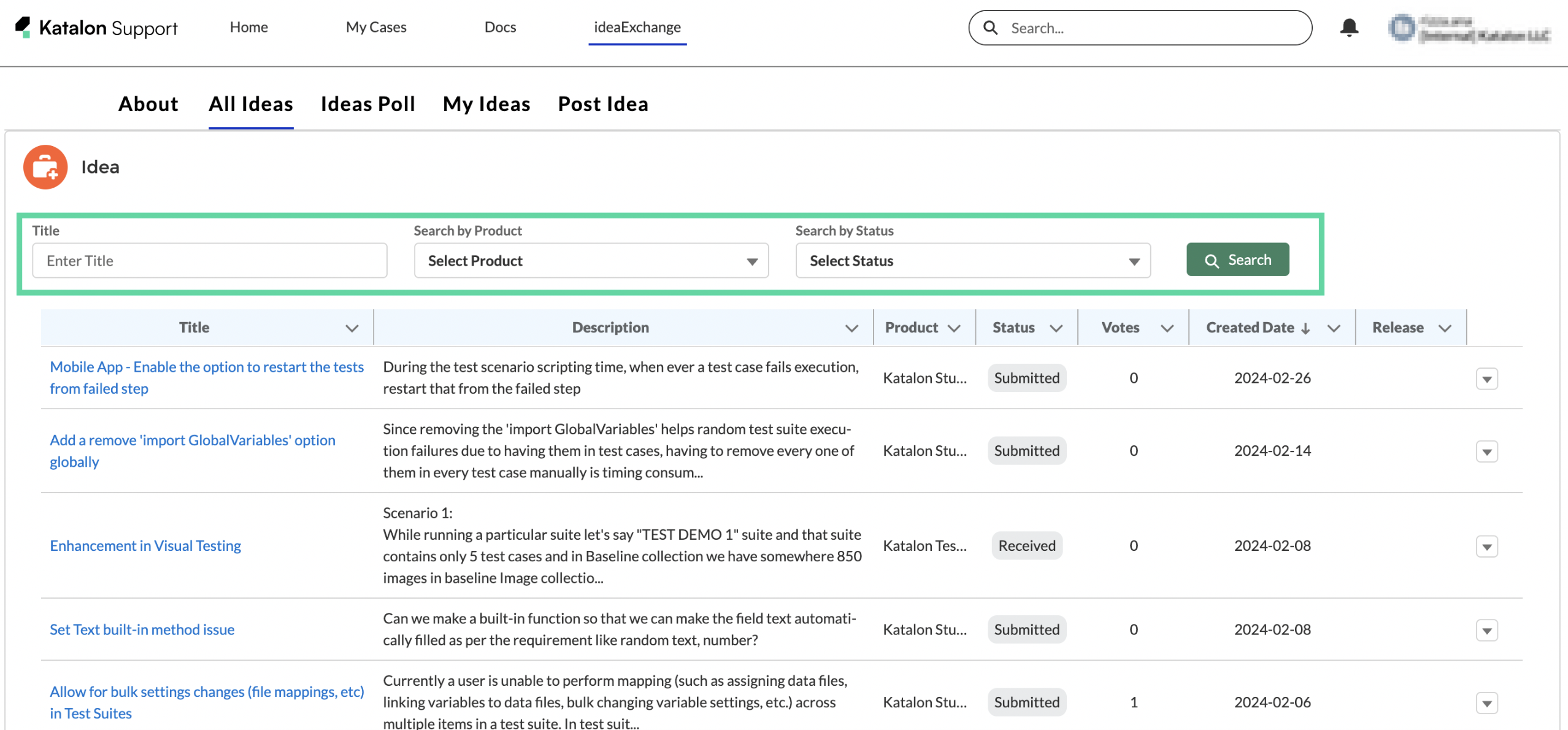 - Received: the Idea has been received and in-review by the Katalon Support Agent.