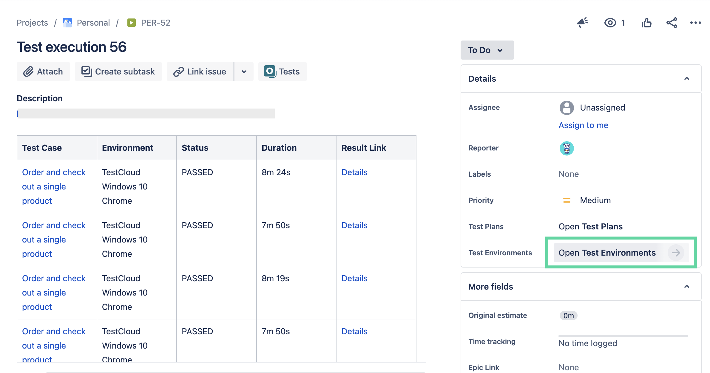 - In the Details section of the Xray test execution, you can also find the test environments on which the test was executed.