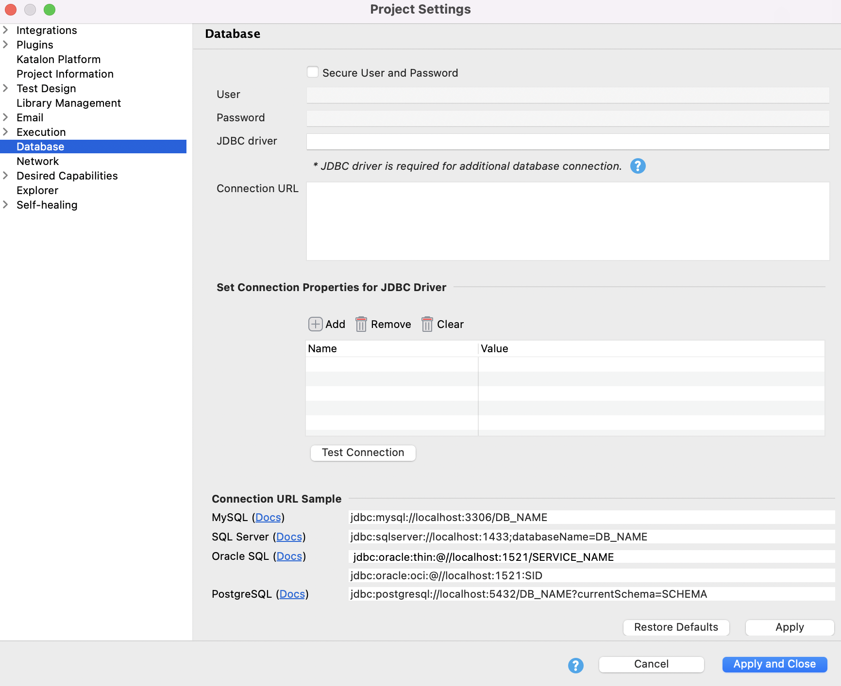 - Connection URL: The connection string of the database server. Katalon Studio supports built-in JDBC Drivers for the following databases: