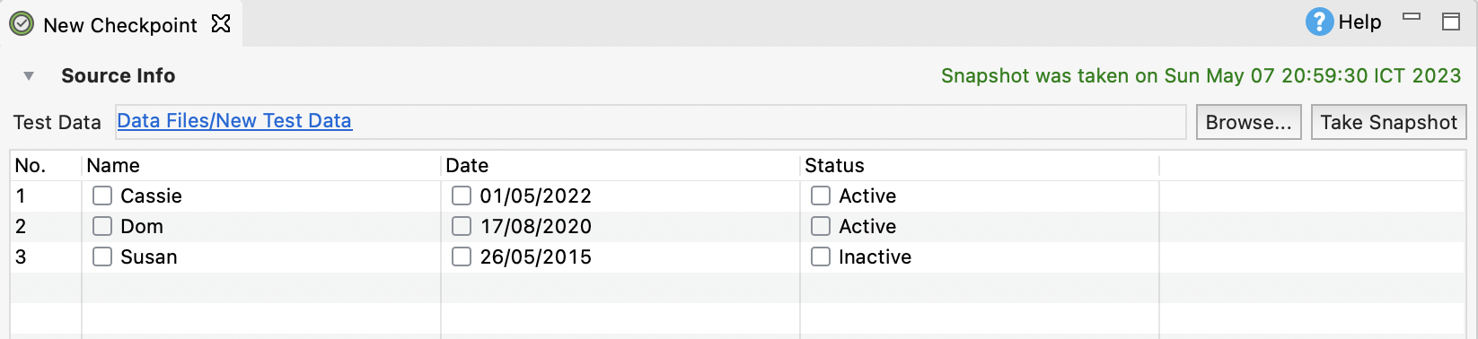 Checkpoint is the snapshot of test data taken at a specific time. A checkpoint is used to verify whether the current state of the data source is different from its previous state.