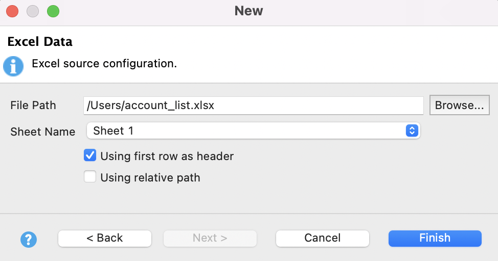 - In the next dialog, click Browse to select the excel file. Specify the excel sheet to be loaded, then click Finish.