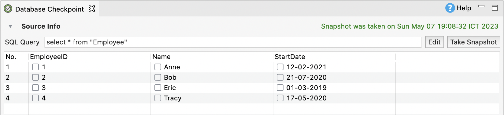 - Click Take Snapshot to take a snapshot of the test data. The state of the selected data source will be captured and displayed in the preview section as below.