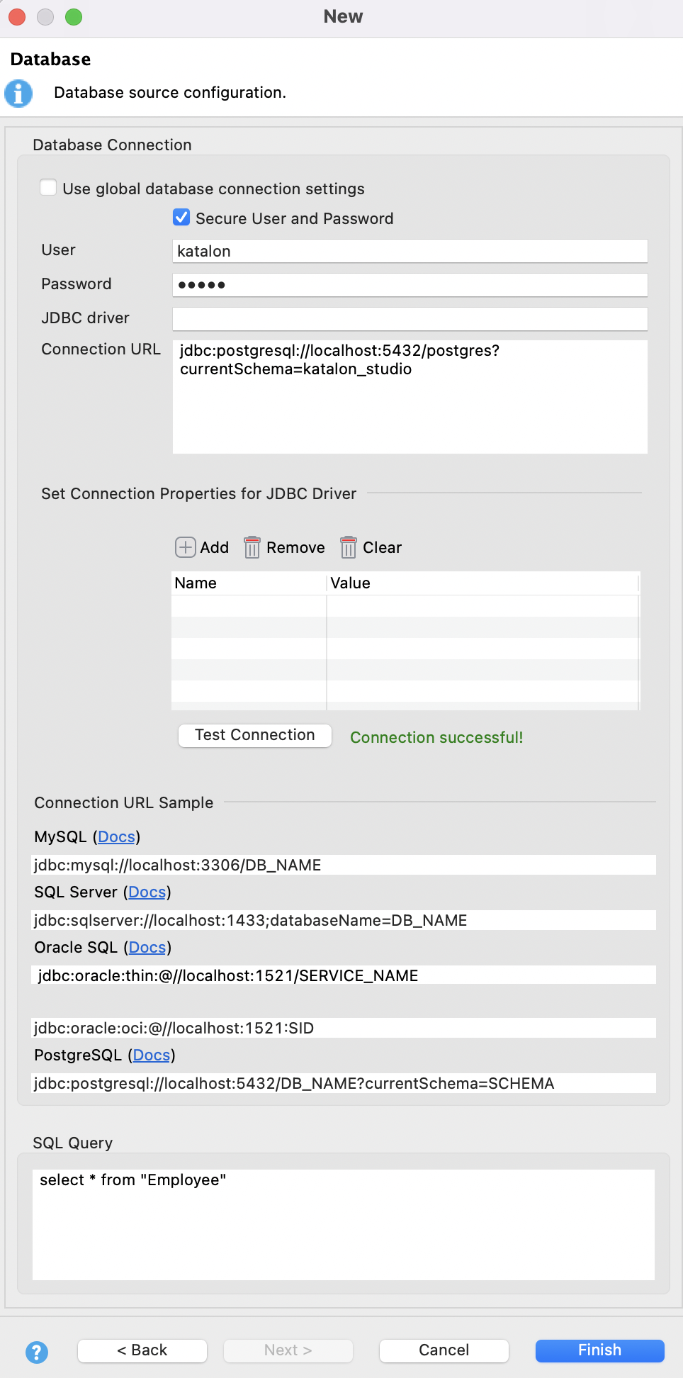 - In the next dialog, enter the database connection details and data query, then click Finish.
