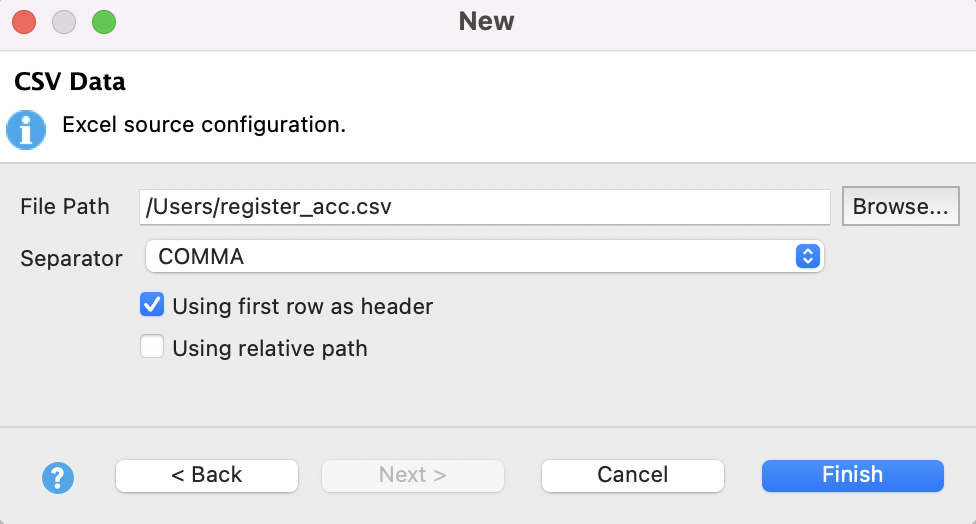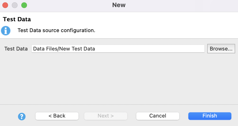 - In the next dialog, click Browse to select from the list of data files defined in Katalon Studio, then click Finish.