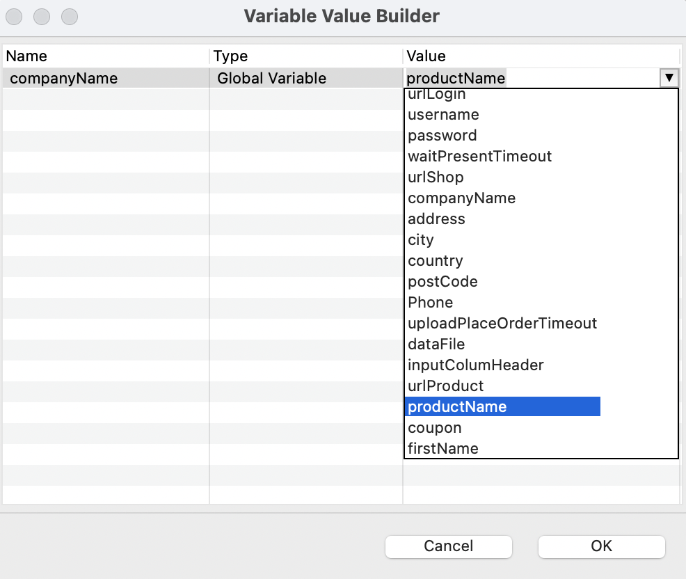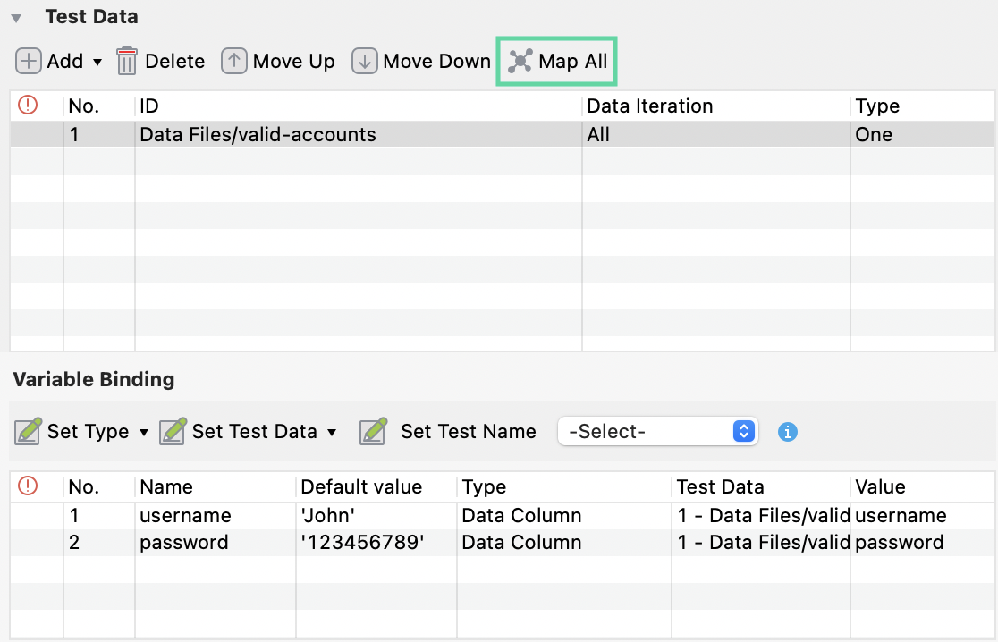 This column is enabled if you set Type as Data Column or Data Column Index. To choose the test data file, double-click the cell under Test Data column of each variable. |