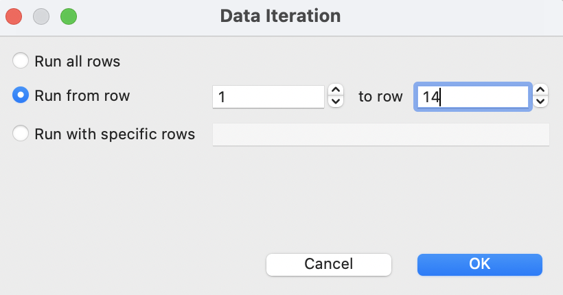 | Run from row ... to row ... | To use the data range from a particular row to another particular row in the data file during the test execution. |