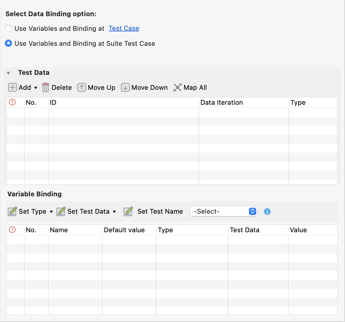 Once you have opened your test suite, click Show Data Binding to expand the Data Binding section.