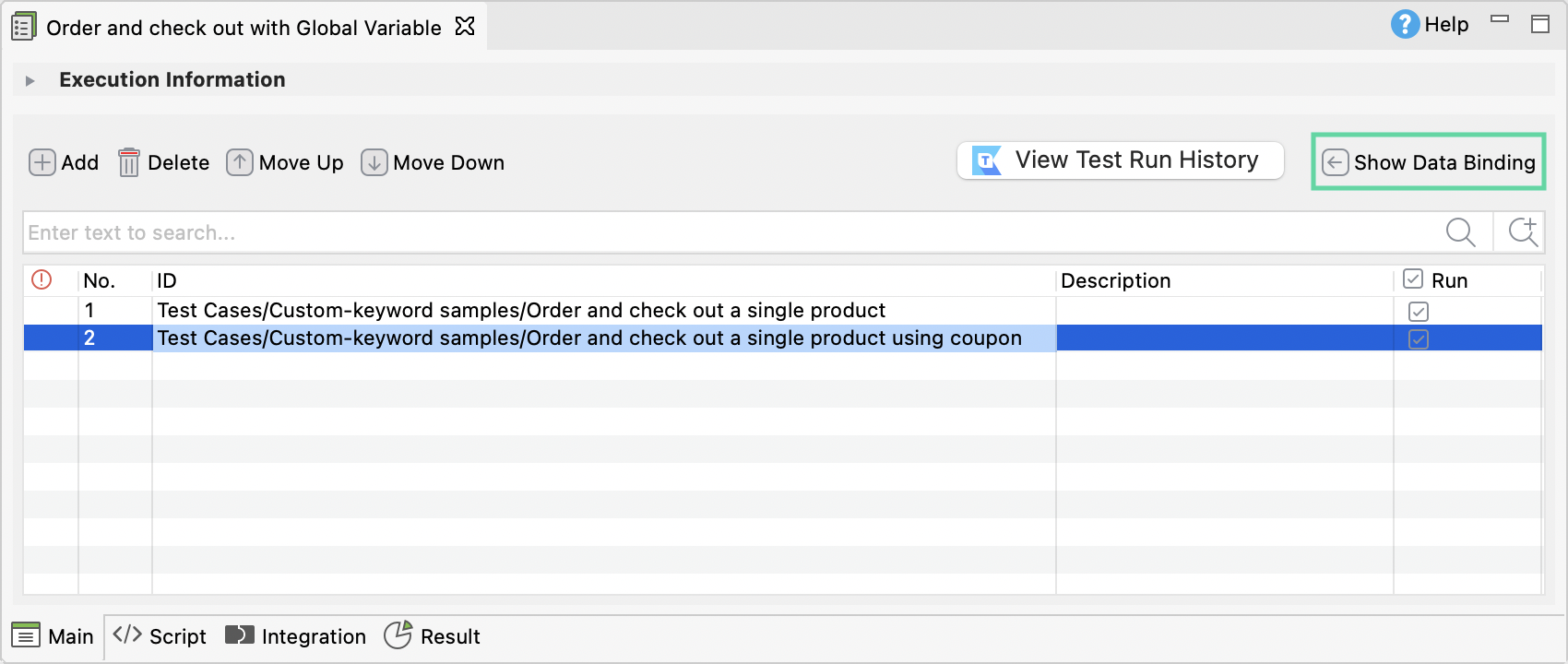 - Variable Binding: This displays all variables of the selected test case.