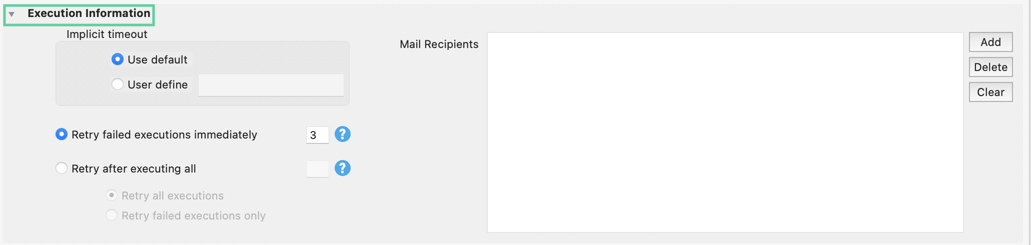 You can specify additional configurations for the test suite execution by expanding the Execution Information section as below:
