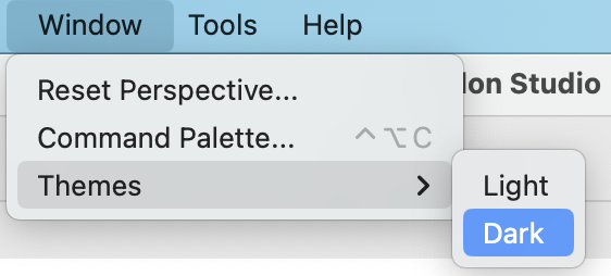 By default, Katalon Studio is in Light theme. To enable the Dark theme, go to Window > Themes > Dark.