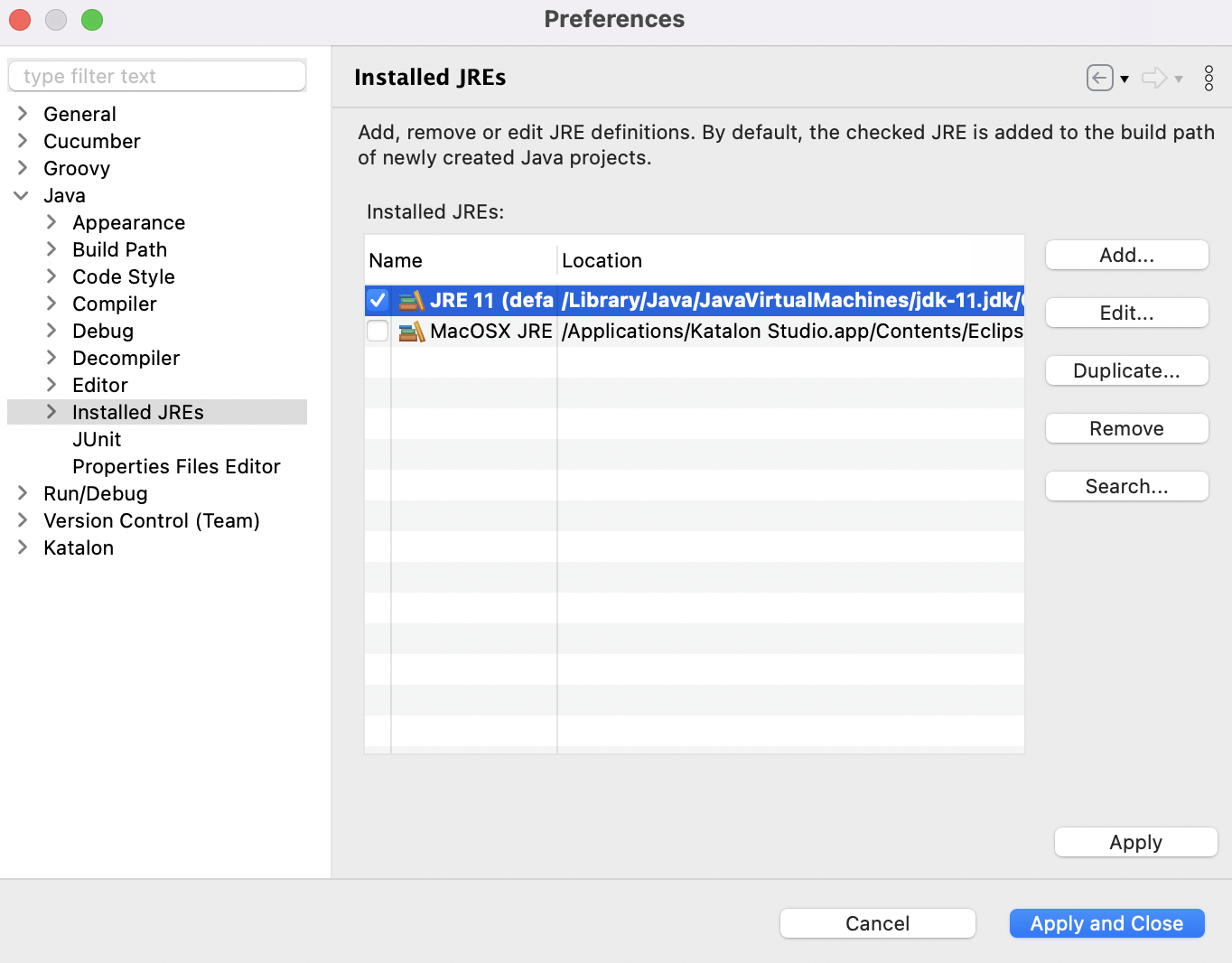 - Set a new default JRE for a Katalon Studio instance.