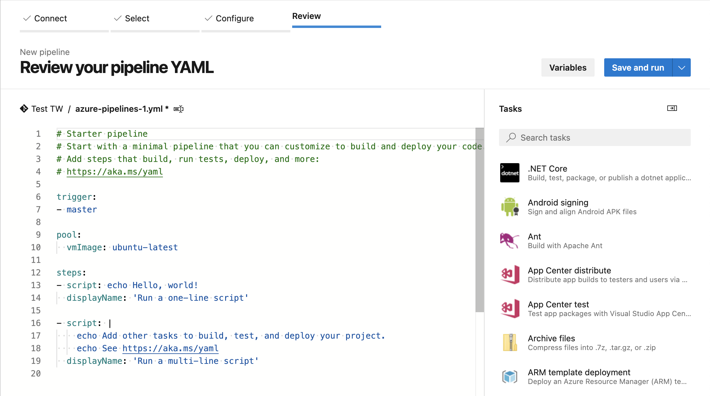 You can refer to the sample yml file for Linux on our GitHub repository: azure-pipelines-linux.yml.