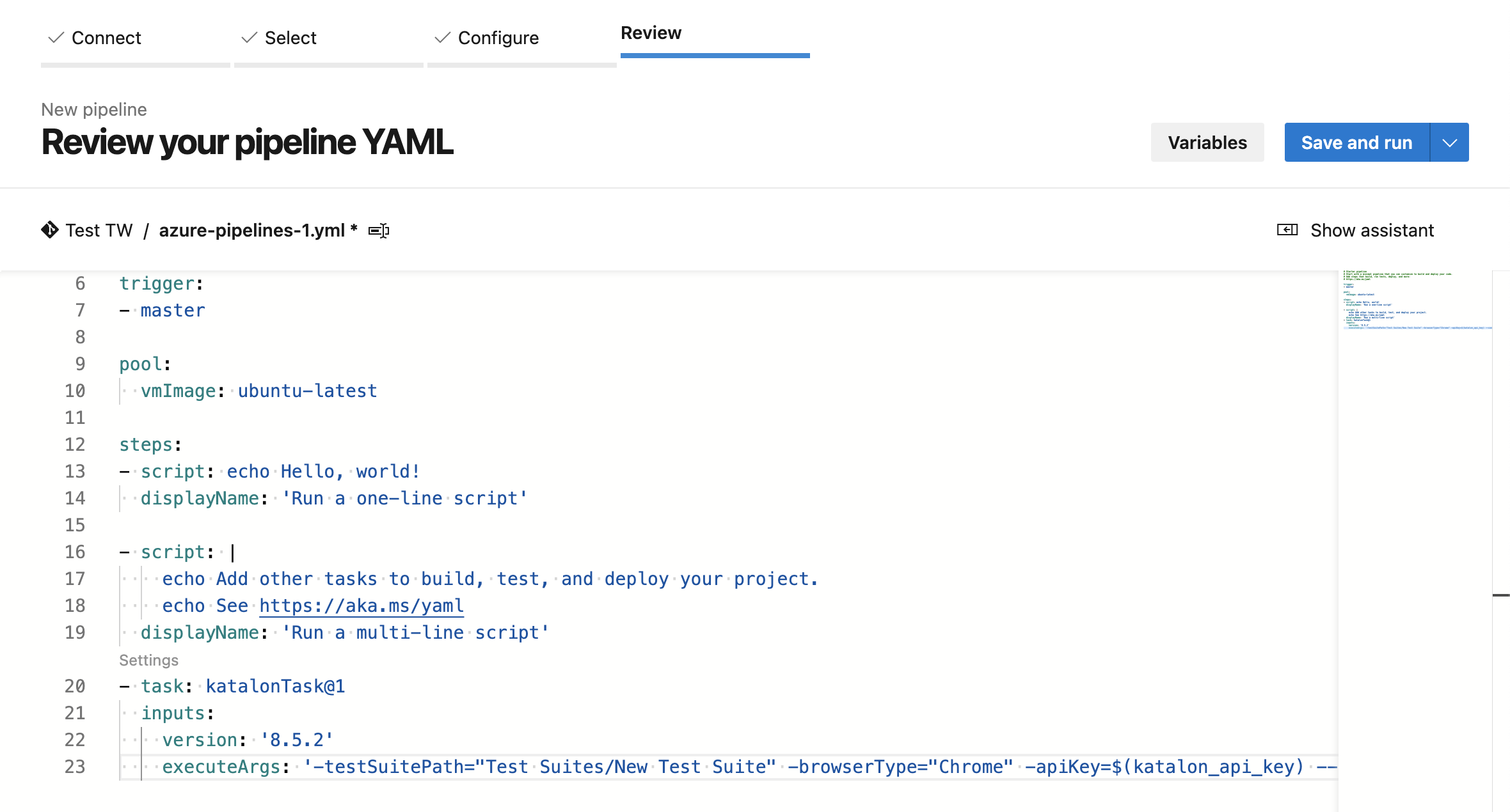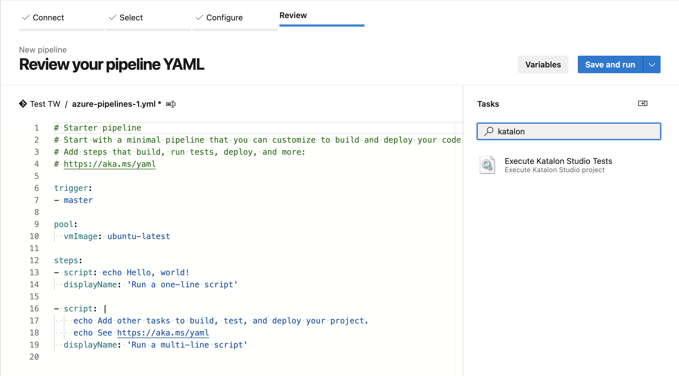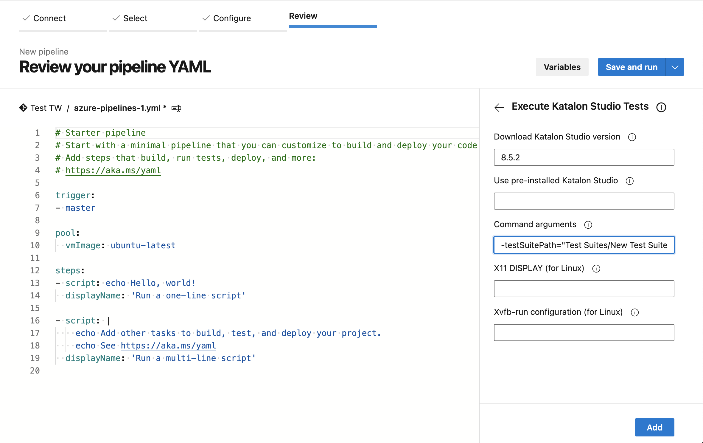 To run your Katalon project on Azure DevOps, you need to configure your pipeline. Do as follows: