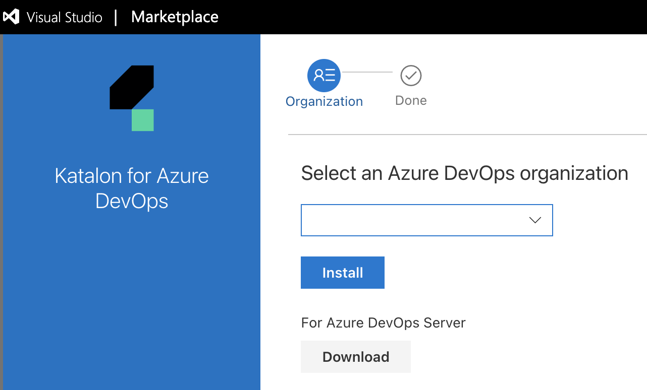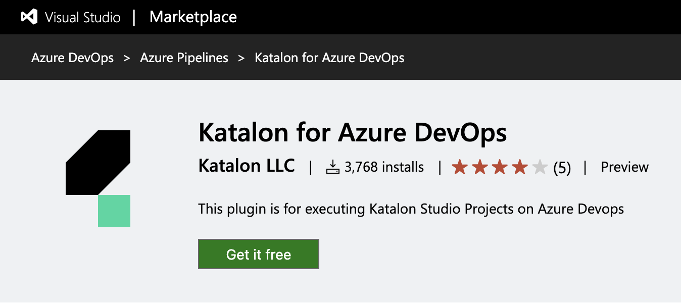 To run Katalon projects with Azure DevOps, you first need to install our Katalon for Azure DevOps extension from the Visual Studio Marketplace. This extension helps download, deploy, and execute Katalon Runtime Engine on Azure DevOps automatically.
