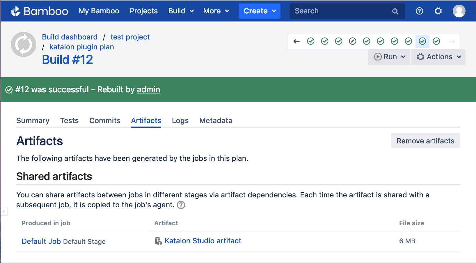 The Katalon Studio for Bamboo plugin enables you to automatically download, deploy, and execute Katalon Studio tests on a Bamboo server.