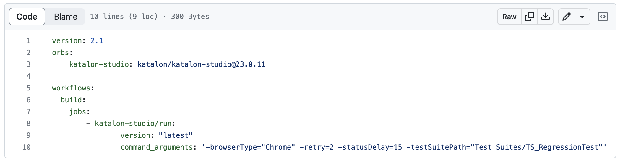 Below is an example of using the Katalon orb to execute a test suite with the latest version of Katalon Studio.