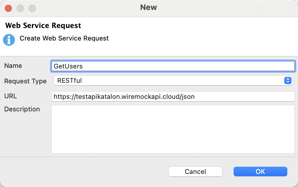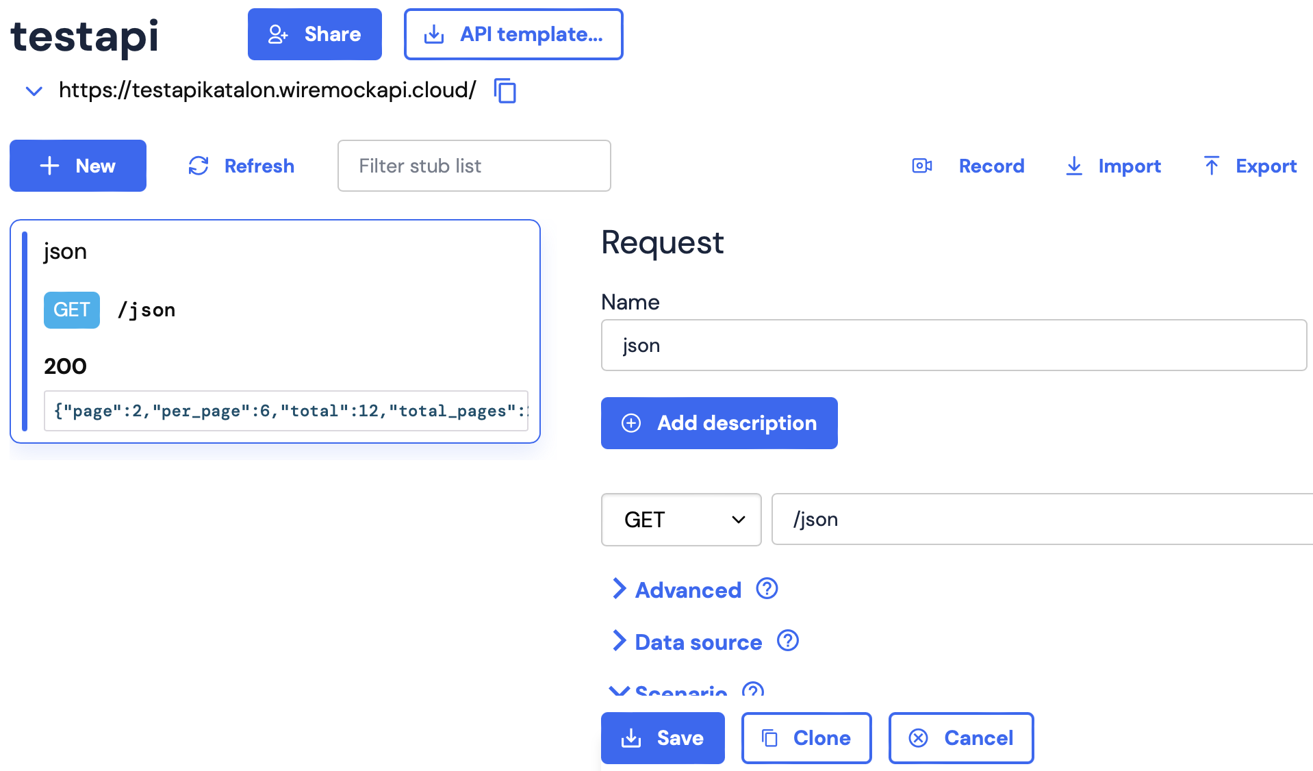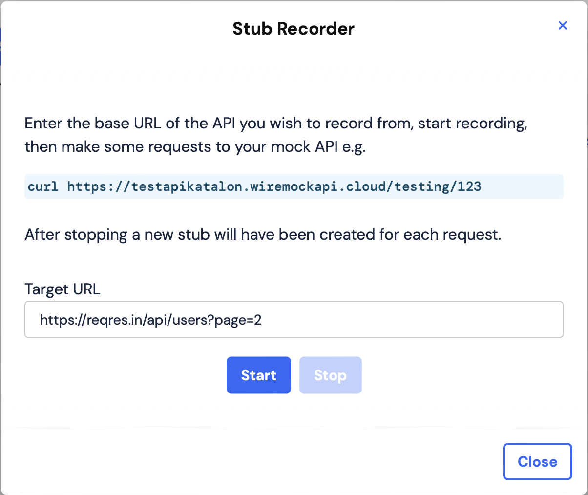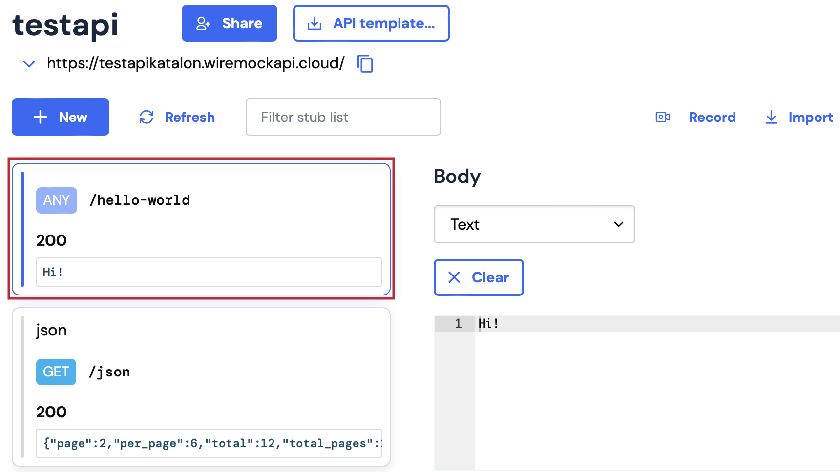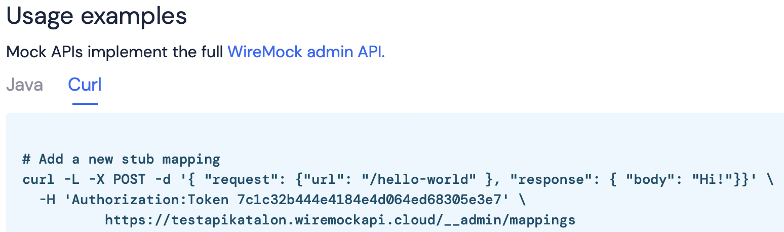 You can create a new stub within Katalon Studio without needing to use the WireMock Cloud user interface. Simply send a POST request with the desired data to set up the stub in WireMock Cloud.