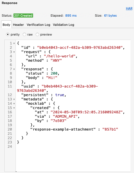 For example, the text { "request": {"url": "/hello-world" }, "response": { "body": "Hi!"}} is a JSON object that defines a stub mapping. This JSON object specifies the request to be matched and the response to be returned by WireMock Cloud.