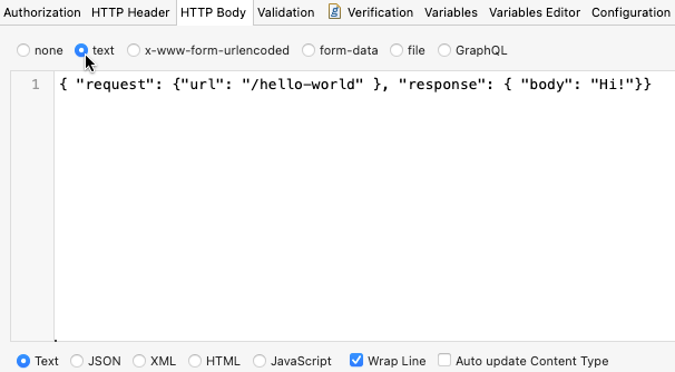 In the HTTP Body section, choose text, then input your stub mapping definition.
