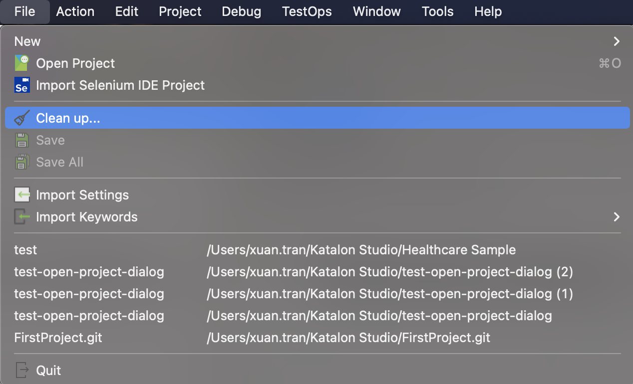 Refresh, clean up, and delete a test project in Katalon Studio