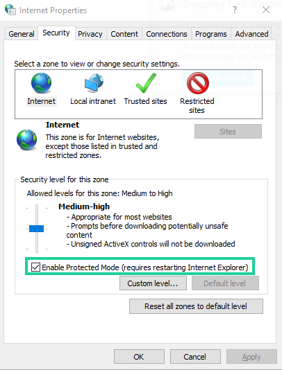 1. Enable Protected Mode must be disabled for all available zones. To do so, choose Internet Options from Control Panel, then switch to the Security tab. Uncheck the Enable Protected Mode option.