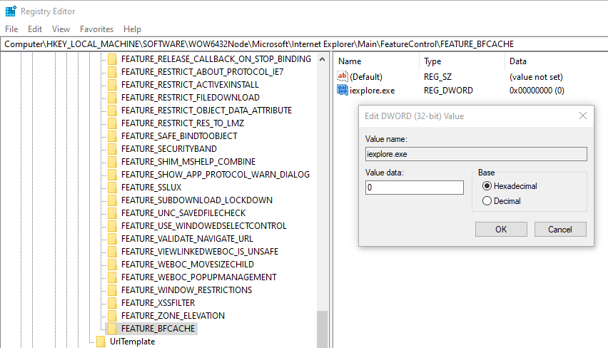 • For 64-bit Windows, the key is at HKEY_LOCAL_MACHINE\SOFTWARE\Wow6432Node\Microsoft\Internet Explorer\Main\FeatureControl\FEATURE_BFCACHE.
