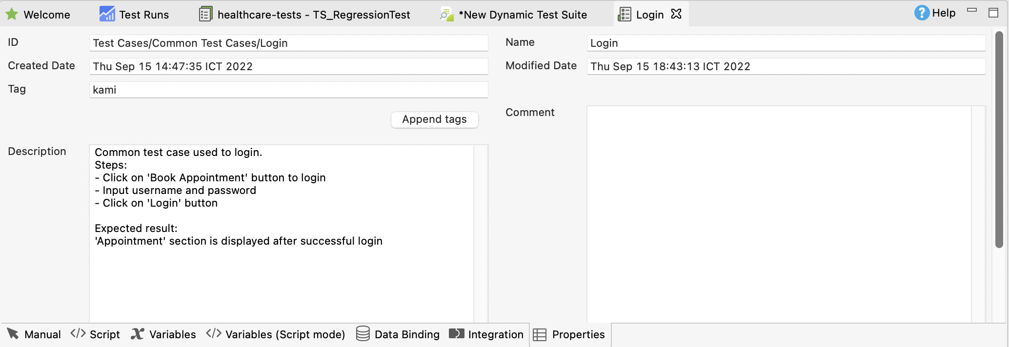 - Open a test case, then switch to the Properties tab. Add a tag to your test case and save your test case. For example, we add a tag called kami.