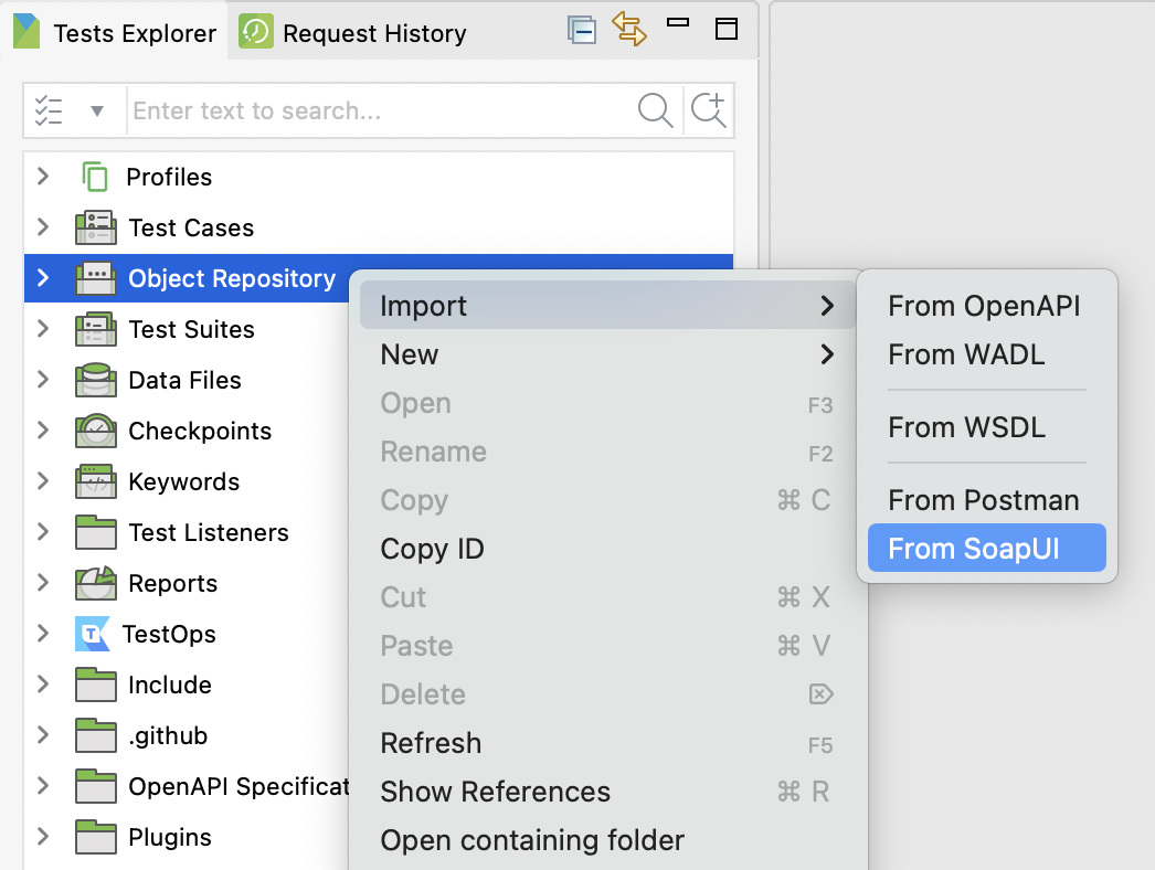 Alternately, you can import REST/SOAP test requests via the Tests Explorer panel. Right-click on Object Repository > Import > From SoapUI.