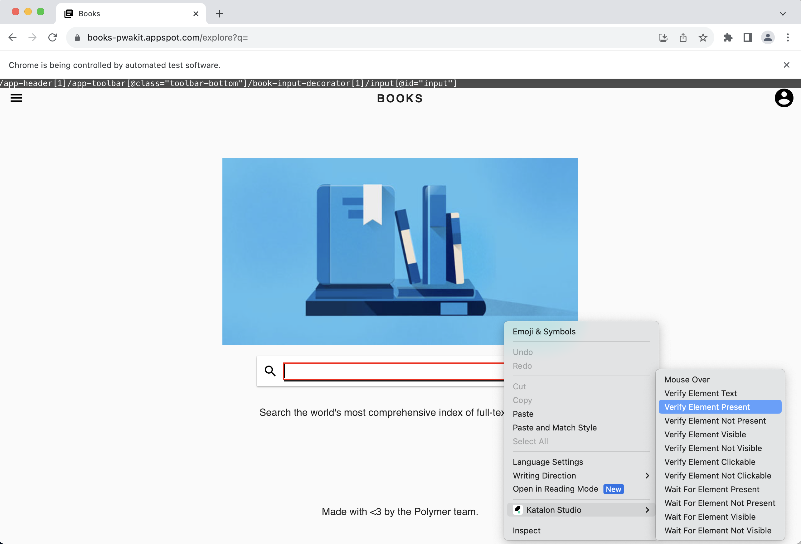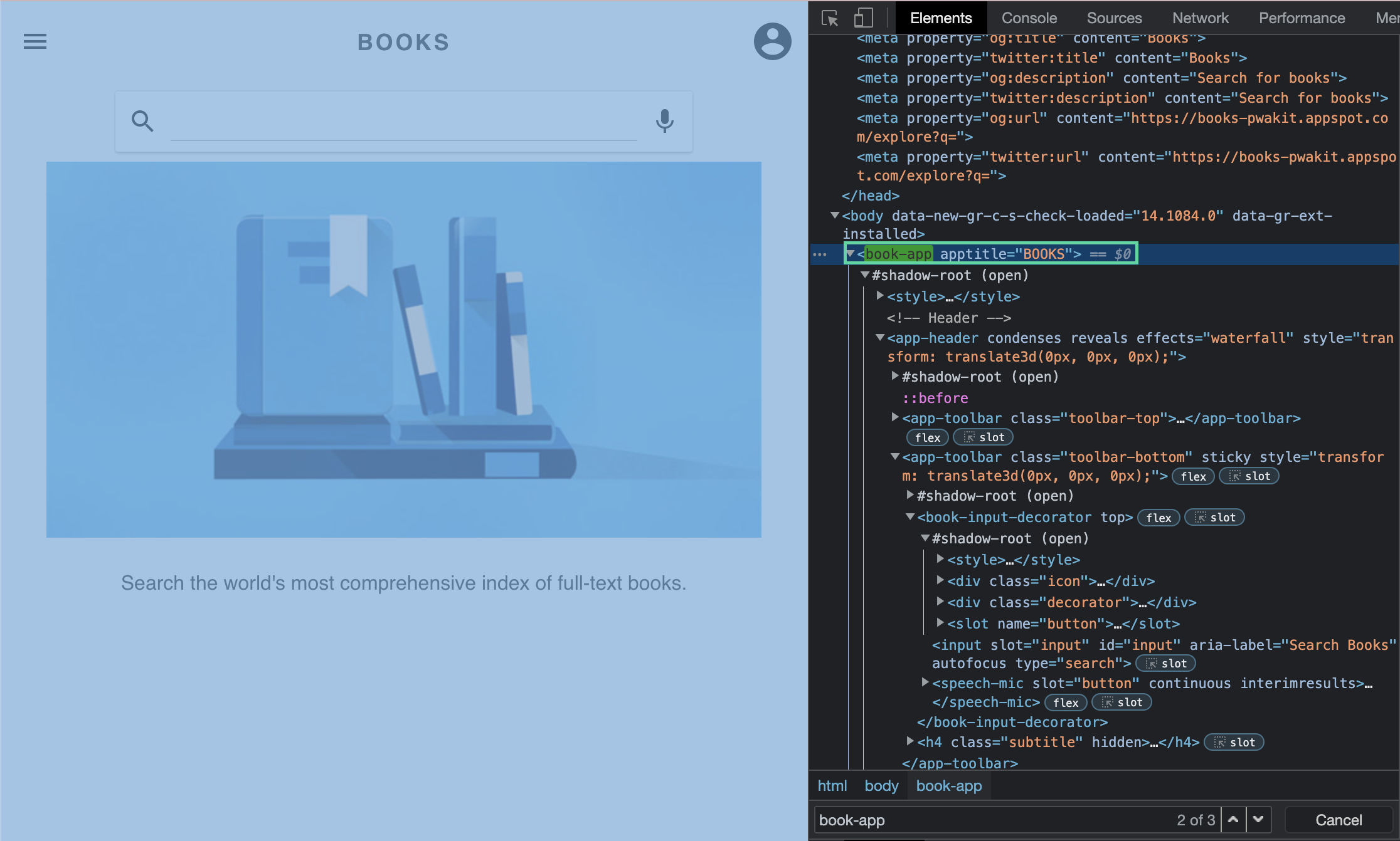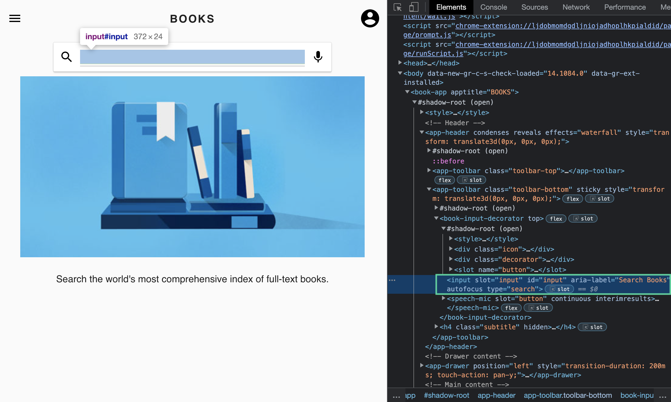 We will demo with the site Books: https://books-pwakit.appspot.com/explore?q= where all the elements are under a shadow root.