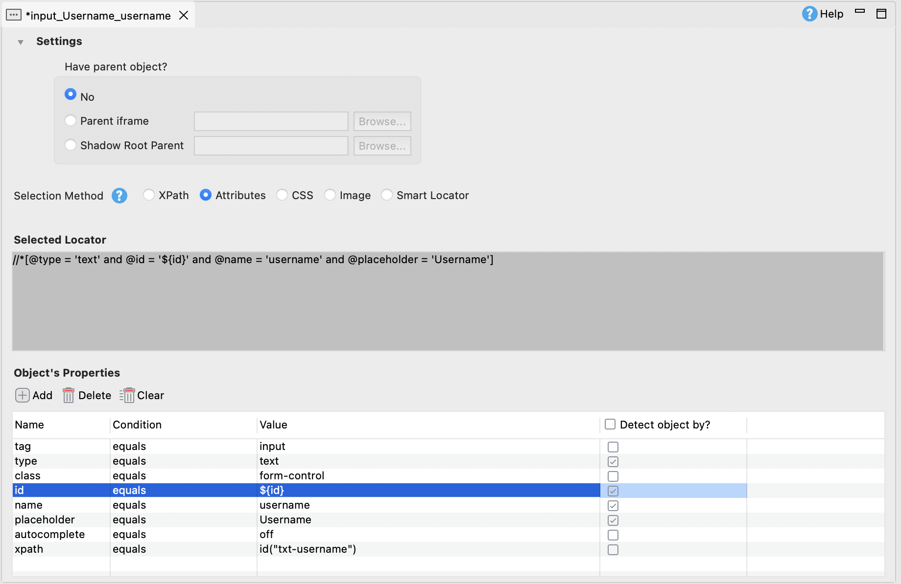 ${<variable name>}as a placeholder for its dynamic property. For example, we create the${id}variable for theidproperty's value. You can use variables in different selection methods.Attributes