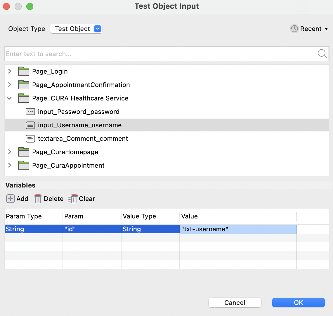 The equivalent result in Script view:WebUI.setText(findTestObject('Page_CURA Healthcare Service/input_Username_username', [('id') : 'txt-username']), Username)