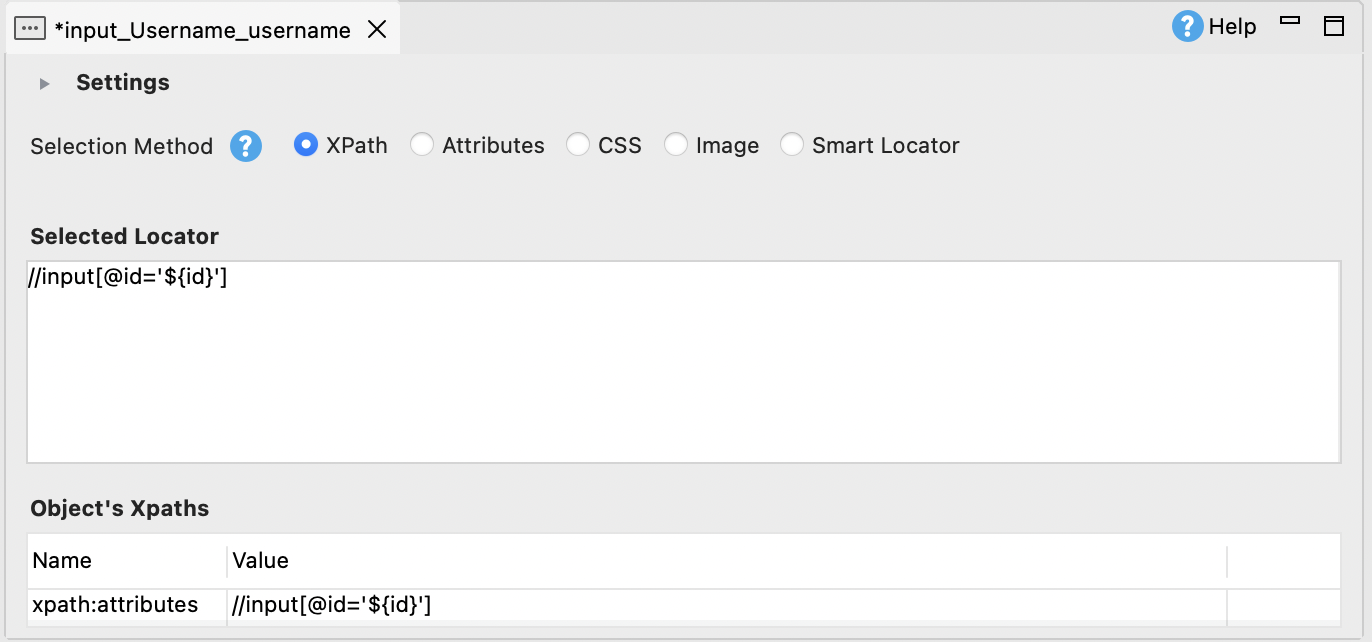 Depending on your preferred selection method, including XPath, Attributes or CSS, the captured object has a corresponding selected locator.