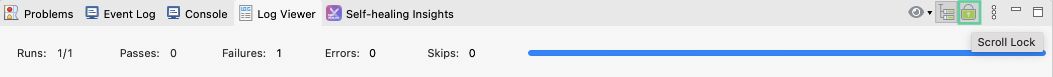While the test is being executed, the Log Viewer is being updated with real-time log messages, where the most recent log messages is shown at the bottom. Therefore, the Log Viewer keeps scrolling down during the test execution. However, users may want to keep the Log Viewer standing still so that they can verify particular log messages. To stop this scrolling behavior, you can select Scroll Lock.