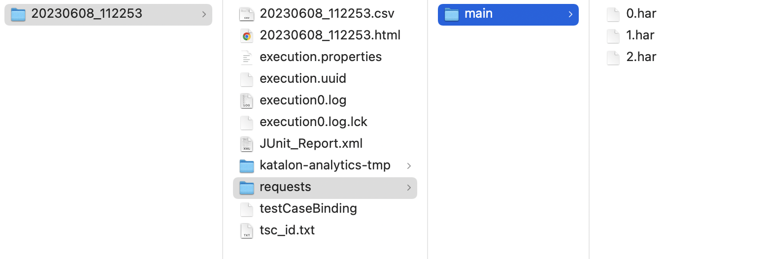 If you execute Web Service test suites, you can right-click at the desired Report folder and choose Open containing folder. The .har files are stored in the main folder of the generated reports folder. For example, the file path can be 20230608_112253/requests/main/0.har.