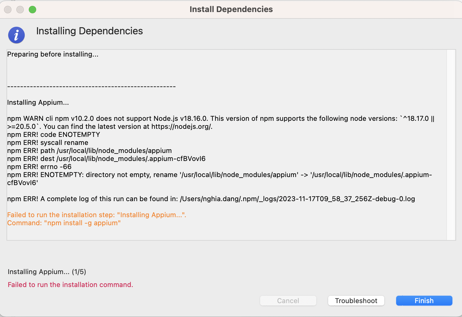 npm version 8 or later.Failed to install Appium.