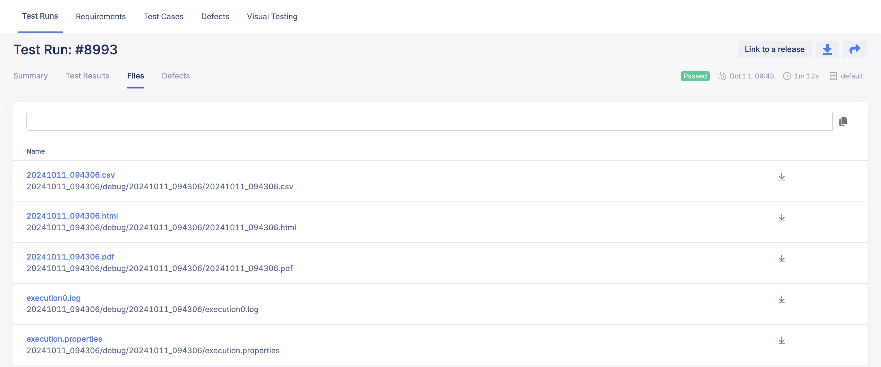 - Select the Files tab. Here you can search for the logs and captured media of the test execution, including: