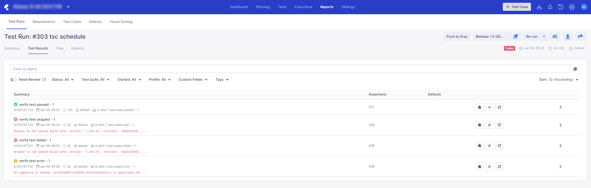 - Click on any row to view its results in a pop up menu to the right of the screen. The Result page displays detailed information about the test run. In the example below, the selected test run is deemed as Failed.
