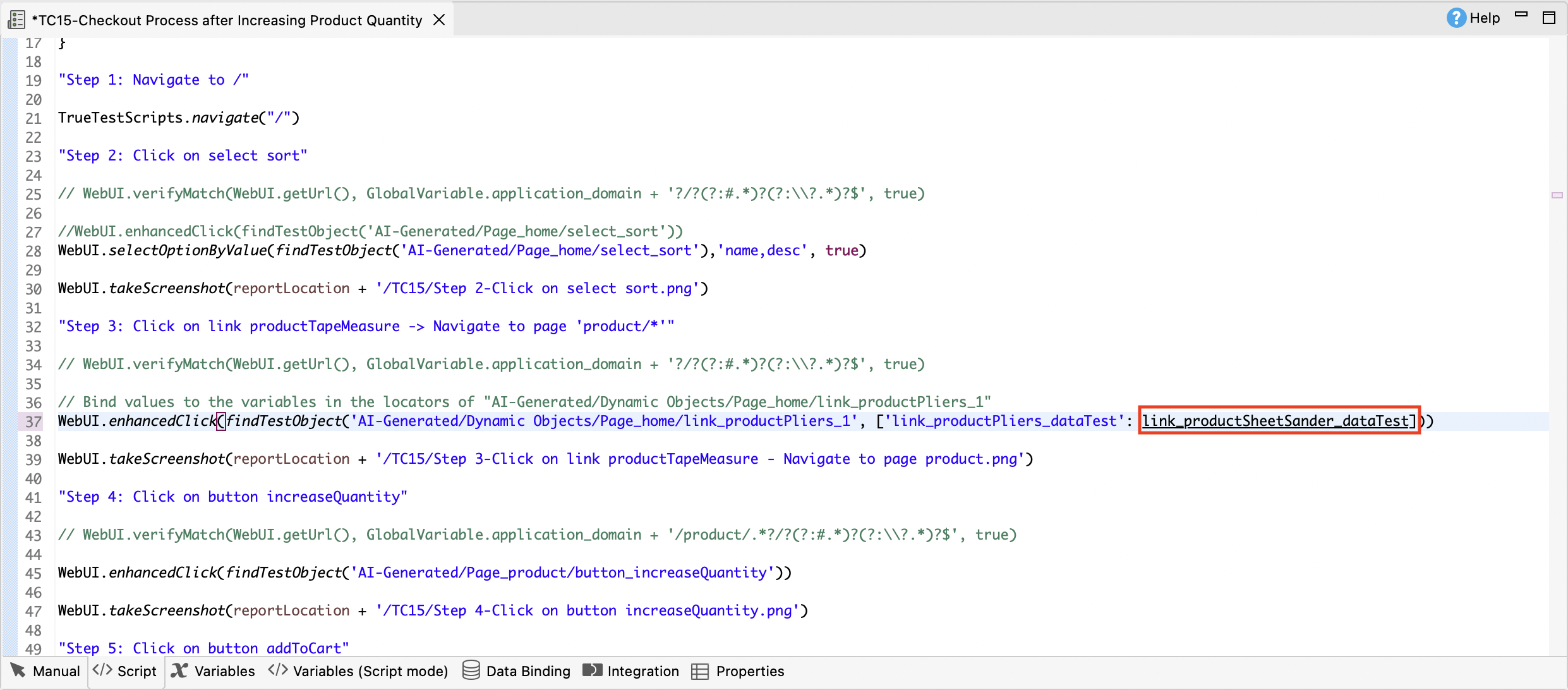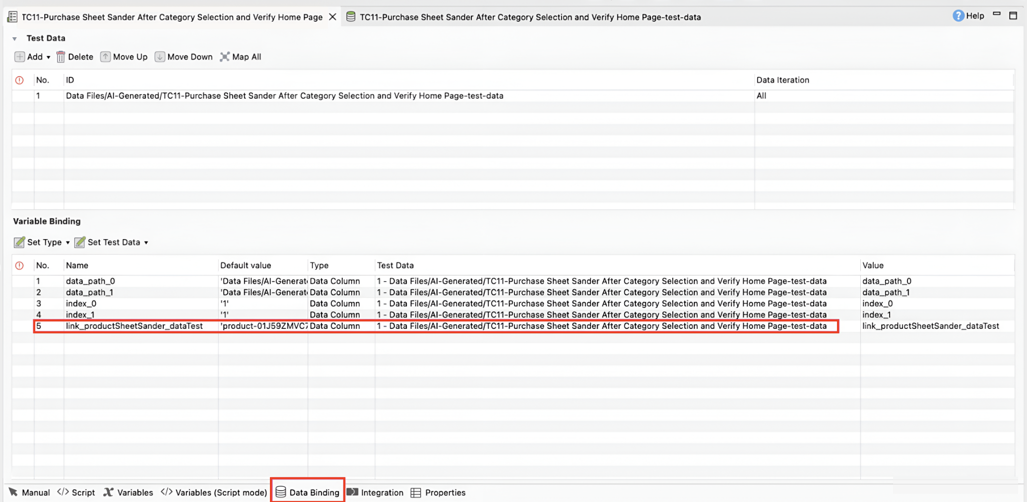 - In the test case Data Binding tab, find the data file that the variable belongs to, and download that data file.